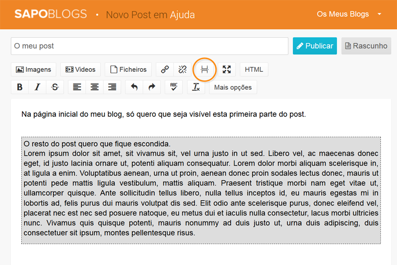 Assim, quando o post é muito extenso, basta selecionar a parte que se quer ocultar (pode incluir texto, imagens e vídeos) e ela deixa de aparecer na primeira página do blog.