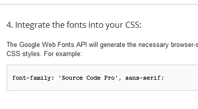 Na página de instalação do tipo de letra, copiem o código CSS fornecido pelo Google (semelhante àquele código na imagem acima).